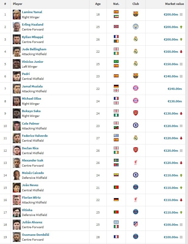 根据德国转会市场的最新估算,2025年的国际足坛有19位身价超过1亿欧元的球员,“亿元先生”俱乐部的规模创造了历史新高,足球市场的繁荣似乎已经达到了乱花渐欲迷人眼的程度。