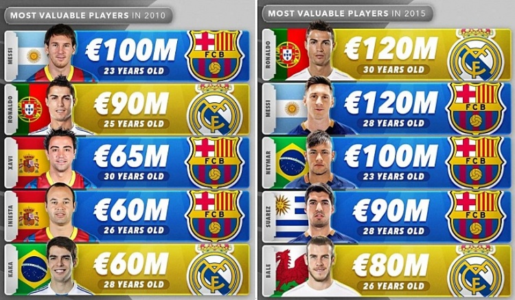 过去十年,球员身价几乎翻了一番,俱乐部引援支出亦是水涨船高。昔日四五千万欧元价位的球员,如今几乎都成为了亿元先生。瓜迪奥拉刚刚来到英超时,曼城可以用5000万欧元的价位得到萨内、伯纳多·席尔瓦、沃克和马赫雷斯,如今只能用更贵的价钱签下马尔穆什、尼科·冈萨雷斯这样的球员,曾经只需要两三千万欧元就可以买到京多安与热苏斯,如今这个价位上只有维托尔·雷斯和特拉福德等人。
